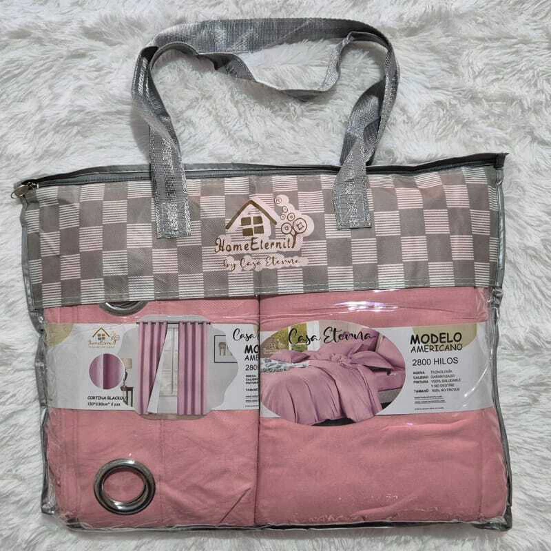 Set de habitación para cama de 2 plazas y media. Incluye sábanas, cobertor de verano y cortinas blackout.